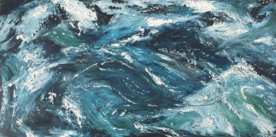 This painting by Amanda Gatlin, Abstract Ocean, captures for me the sense of chaotic swirl that is often present in the telling of our stories.